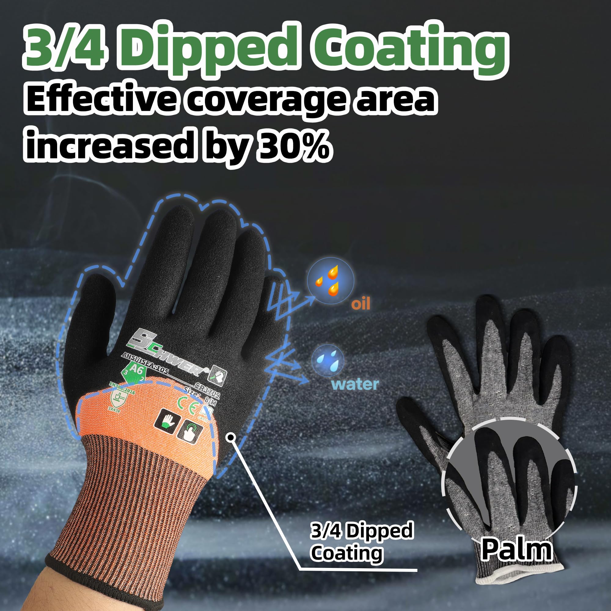 - 3/4 Nitrile Coating - These cut-resistant work gloves feature a 3/4 dip design, providing more back-of-hand protection than palm dip gloves, effectively increases coating coverage area by 30%. The sandy nitrile coating provides outstanding abrasion resistance and grip, even in wet and greasy conditions.