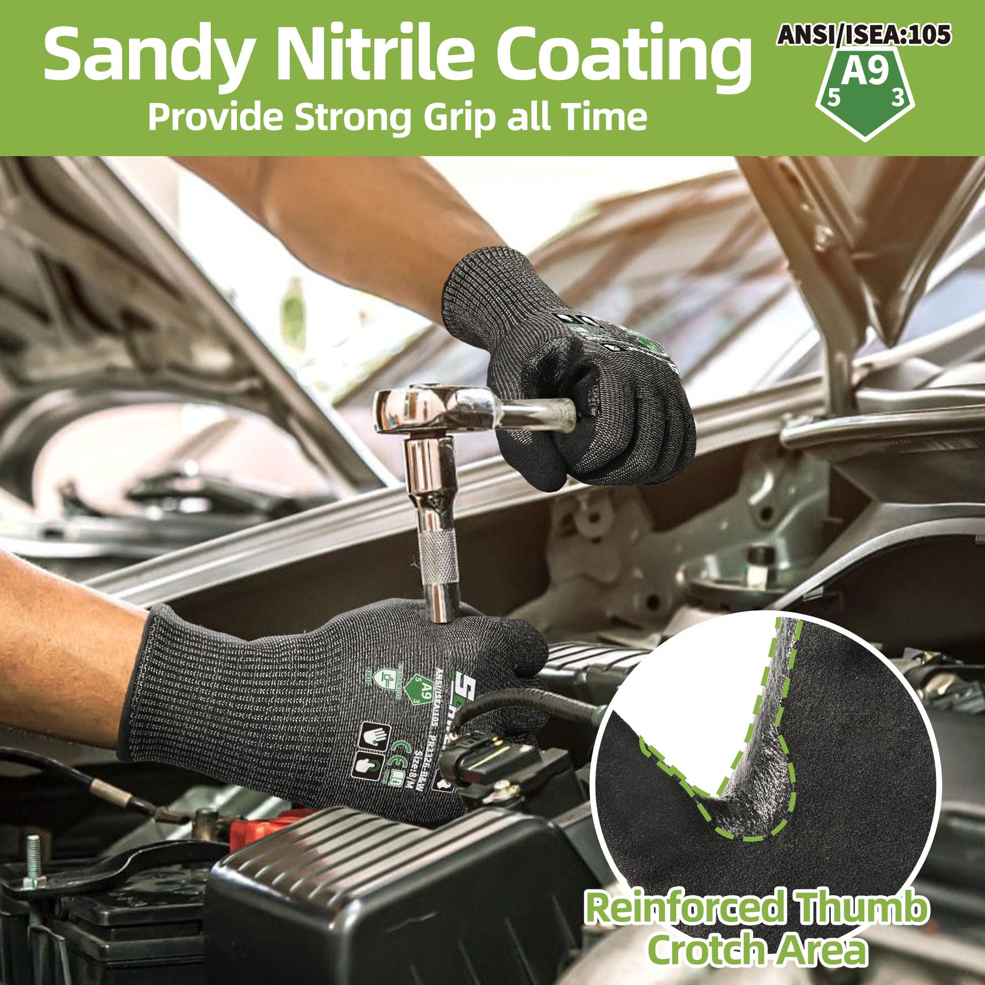 - 【Superior Abrasion and Durable】These men's work gloves boast sandy nitrile coating known for its exceptional abrasion resistance and anti-slip capabilities, ensuring excellent grip even in wet and greasy conditions. With reinforced thumb crotches, they offer durability ten times stronger than ordinary level 5 cut-resistant gloves, making them the ideal choice for various working environments